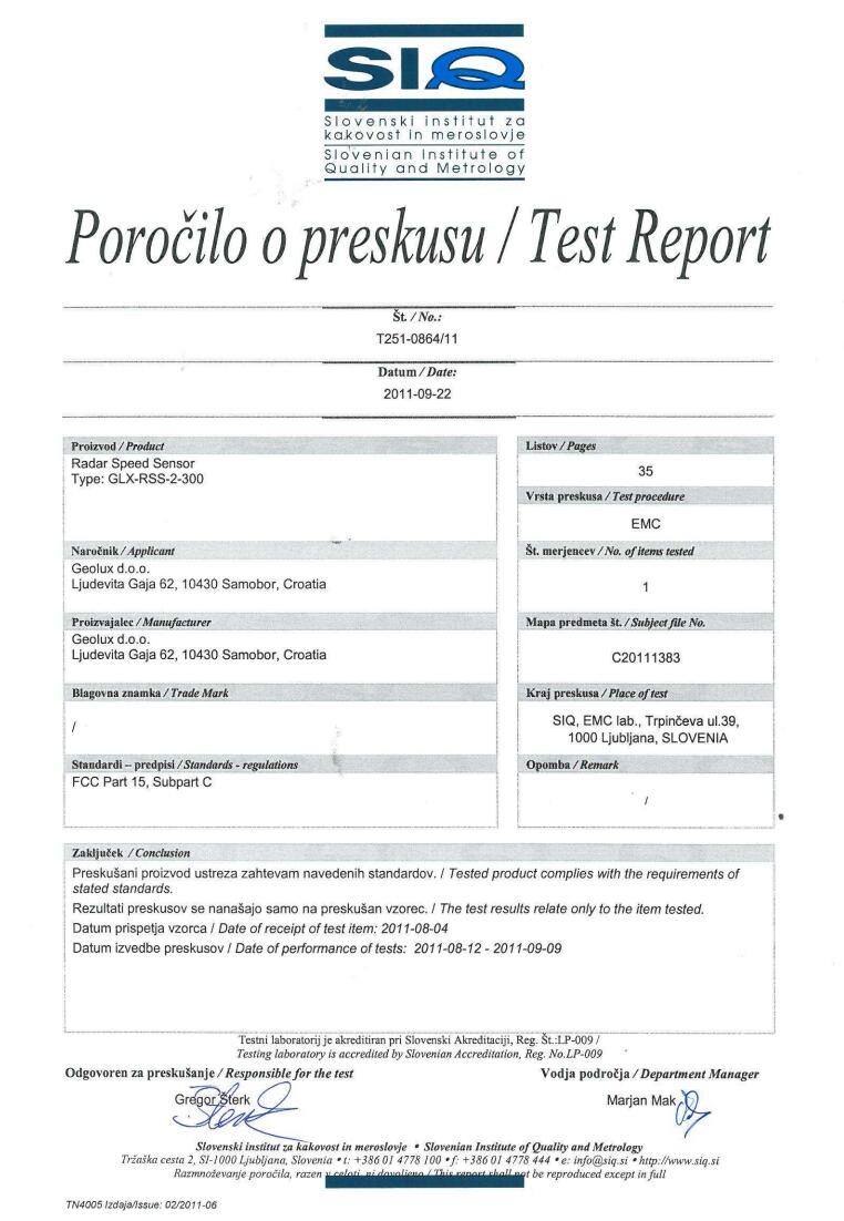 Test performed by: SIQ – Slovenian Institute of Quality and Metrology Test report No.: T251-0864/11 Date: 2011-09-22 Standards: FCC Part 15, Subpart C |
